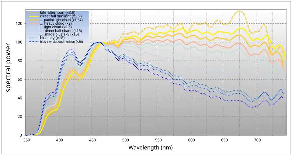 The Sun may be said to illuminate, which is a measure of the light within a specific sensitivity range. Many animals (including humans) have a sensitivity range of approximately 400–700 nm,[47] and given optimal conditions the absorption and scattering by Earth's atmosphere produces illumination that approximates an equal-energy illuminant for most of this range.[48] The useful range for color vision in humans, for example, is approximately 450–650 nm. Aside from effects that arise at sunset and sunrise, the spectral composition changes primarily in respect to how directly sunlight is able to illuminate. When illumination is indirect, Rayleigh scattering in the upper atmosphere will lead blue wavelengths to dominate. Water vapour in the lower atmosphere produces further scattering and ozone, dust and water particles will also absorb particular wavelengths.[49][50]