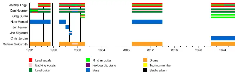 Sunny Day Real Estate is an American emo band from Seattle, Washington, formed in 1992. The band currently consists of founding members Jeremy Enigk (vocals, guitar), Dan Hoerner (guitar) and William Goldsmith (drums), alongside Greg Suran (guitar), who originally played with the band between 2000 and 2001, and Chris Jordan (bass), who joined the band in 2022. Founding bass guitarist Nate Mendel was a member of the band during three of its four incarnations.