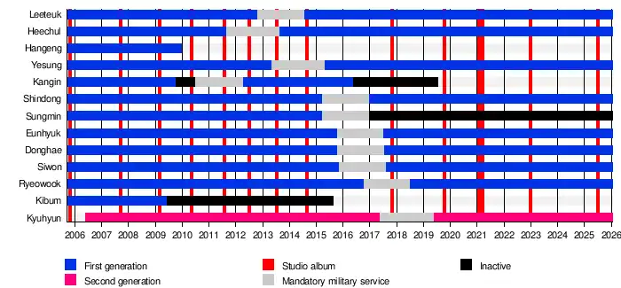 All members completed their mandatory military service during the time period from September 2011 through May 2019. Heechul enlisted on September 1, 2011, and completed his service on August 30, 2013. Leeteuk enlisted on October 30, 2012, and completed his service on July 29, 2014.[174][175] Yesung enlisted on May 6, 2013, and completed his service on May 4, 2015.[176] Shindong enlisted on March 24, 2015, and completed his service on December 23, 2016.[177] Sungmin enlisted on March 31, 2015, and completed his service on December 30, 2016.[178] Eunhyuk enlisted for active duty military service on October 13, 2015. He was discharged on July 12, 2017.[179][180] Donghae enlisted on October 15, 2015, and was discharged on July 14, 2017.[181] Siwon enlisted on November 19, 2015, and was discharged on August 18, 2017.[182] Ryeowook enlisted on October 11, 2016,[183] and was discharged on July 10, 2018. Kyuhyun was the last member in military service; he enlisted on May 25, 2017, and was discharged on May 7, 2019.[184]