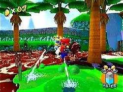 In this game, Mario is joined by a robotic backpack named F.L.U.D.D. (Flash Liquidizer Ultra Dousing Device), which uses the power of water to clean goop and help Mario reach new places. Mario starts with two default nozzles for F.L.U.D.D., Squirt and Hover, which he can switch between. The Squirt nozzle lets Mario spray a stream of water, which he can use to clean sludge, attack enemies, and activate certain mechanisms. The Hover nozzle lets Mario hover in the air for a short period of time, allowing him to cross large gaps while simultaneously spraying things directly below him. As the game progresses, Mario unlocks two additional nozzles for F.L.U.D.D. which can be substituted with the Hover nozzle: the Rocket nozzle, which shoots Mario high up into the air; and the Turbo nozzle, which moves Mario at high speeds, allowing him to run across water and break into certain areas. Each of F.L.U.D.D.'s nozzles use water from its reserves, which can be refilled via water sources such as rivers or fountains. There are also various secret courses where F.L.U.D.D. is taken away from Mario, forcing him to rely on his natural platforming abilities.[7] Unlike Super Mario 64, Mario cannot long jump; he can instead perform a spin jump by twirling the analog stick and jumping, allowing him to jump higher and farther. Mario can also perform dives at any time, giving him the ability to slide quickly across wet surfaces.