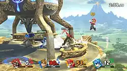Controls are simpler than other fighting games, with one button used for standard attacks and a second used for special attacks.[48][52] Each character has a unique moveset; players can use different moves by attacking while inputting a certain direction on the analog stick or while their character is in a certain state, such as midair.[53][54] Powerful "smash attacks" can be used by quickly moving the analog stick and pressing the attack button,[55] and can become even stronger if charged by holding down the button.[50][11] Each character has four smash attacks—one for each direction[48]—and five standard, special, and aerial attacks, with four corresponding to directions and the other initiated by pressing the button without any directional input.[53]