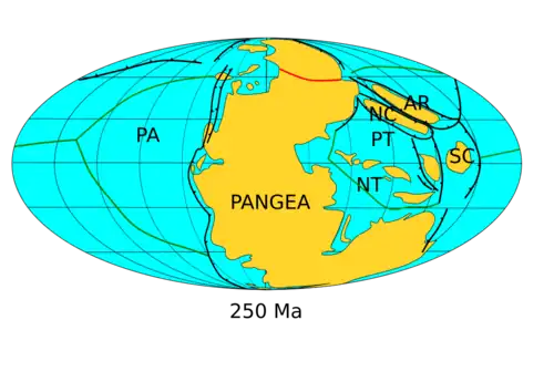 The supercontinent of Pangaea with the positions of the continents at the Permian-Triassic boundary, about 250 Ma. AR=Amuria; NC=North China; SC=South China; PA=Panthalassic Ocean; PT=Paleotethys Ocean; NT=Neotethys Ocean. Orogens shown in red. Subduction zones shown in black. Spreading centers shown in green.