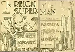 Jerry Siegel and Joe Shuster met in 1932 while attending Glenville High School in Cleveland and bonded over their admiration of fiction. Siegel aspired to become a writer and Shuster aspired to become an illustrator. Siegel wrote amateur science fiction stories, which he self-published as a magazine called Science Fiction: The Advance Guard of Future Civilization. His friend Shuster often provided illustrations for his work.[4] In January 1933, Siegel published a short story in his magazine titled "The Reign of the Superman". The titular character is a homeless man named Bill Dunn who is tricked by an evil scientist into consuming an experimental drug. The drug gives Dunn the powers of mind-reading, mind-control, and clairvoyance. He uses these powers maliciously for profit and amusement, but then the drug wears off, leaving him a powerless vagrant again. Shuster provided illustrations, depicting Dunn as a bald man.[5]
