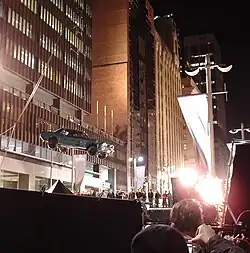 Superman Returns was shot using Panavision's Genesis digital camera.[45] Production designer Guy Hendrix Dyas was influenced by Frank Lloyd Wright's Johnson Wax Headquarters for the design of the Daily Planet.[46] ESC Entertainment was originally set to design the visual effects sequences, but Warner Bros. replaced them with the hiring of Mark Stetson from Sony Pictures Imageworks as the visual effects supervisor.[47] A total of 1,400 visual effects shots were created.[41] The script required a scene of Superman safely delivering a Boeing 777 in a baseball park where computer-generated imagery was used as it would have been impossible to assemble the number of extras for the shots. A second unit crew headed by Dan Bradley and Brian Smrz traveled to Dodger Stadium to photograph elements that were composited into the final images.[48] The scenes of Metropolis was actually a modified version of the skyline of Manhattan. Using footage from the original Superman (1978) film as a reference point, Marlon Brando was re-created by Rhythm & Hues Studios using CGI.[49] The opening credits for Superman Returns are presented in an intended recreation of the style used for Superman, again to the accompaniment of John Williams's theme music.[50]
