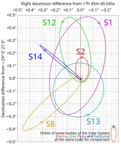 - ^ a b Ghez, A. M.; Salim, S.; Hornstein, S. D.; Tanner, A.; Lu, J. R.; Morris, M.; Becklin, E. E.; Duchêne, G. (May 2005). "Stellar Orbits around the Galactic Center Black Hole". The Astrophysical Journal. 620 (2): 744–757. arXiv:astro-ph/0306130. Bibcode:2005ApJ...620..744G. doi:10.1086/427175. S2CID 8656531.