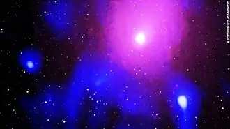 In February 2020, astronomers reported the discovery of the Ophiuchus Supercluster eruption, the most energetic event in the Universe ever detected since the Big Bang.[125][126][127] It occurred in the Ophiuchus Cluster in the galaxy NeVe 1, caused by the accretion of nearly 270 million M☉ of material by its central 7 billion M☉ supermassive black hole.[128] The eruption lasted for about 100 million years and released 5.7 million times more energy than the most powerful gamma-ray burst known. The eruption released shock waves and jets of high-energy particles that punched the intracluster medium, creating a cavity about 1.5 million light-years wide – ten times the Milky Way's diameter.[129][125][126][127]
