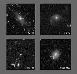 - ^ Chiaberge, M.; Ely, J. C.; Meyer, E. T.; Georganopoulos, M.; Marinucci, A.; Bianchi, S.; Tremblay, G. R.; Hilbert, B.; Kotyla, J. P.; Capetti, A.; Baum, S. A.; Macchetto, F. D.; Miley, G.; O'Dea, C. P.; Perlman, E. S. (April 1, 2017). "The puzzling case of the radio-loud QSO 3C 186: a gravitational wave recoiling black hole in a young radio source?". Astronomy and Astrophysics. 600: A57. arXiv:1611.05501. Bibcode:2017A&A...600A..57C. doi:10.1051/0004-6361/201629522. ISSN 0004-6361. S2CID 27351189.