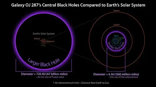 - ^ Valtonen, M. J.; Ciprini, S.; Lehto, H. J. (2012). "On the masses of OJ287 black holes". Monthly Notices of the Royal Astronomical Society. 427 (1): 77–83. arXiv:1208.0906. Bibcode:2012MNRAS.427...77V. doi:10.1111/j.1365-2966.2012.21861.x. S2CID 118483466.