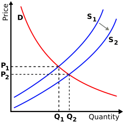 When technological progress occurs, the supply curve shifts. For example, assume that someone invents a better way of growing wheat so that the cost of growing a given quantity of wheat decreases. Otherwise stated, producers will be willing to supply more wheat at every price and this shifts the supply curve S1 outward, to S2—an increase in supply. This increase in supply causes the equilibrium price to decrease from P1 to P2. The equilibrium quantity increases from Q1 to Q2 as consumers move along the demand curve to the new lower price. As a result of a supply curve shift, the price and the quantity move in opposite directions. If the quantity supplied decreases, the opposite happens. If the supply curve starts at S2, and shifts leftward to S1, the equilibrium price will increase and the equilibrium quantity will decrease as consumers move along the demand curve to the new higher price and associated lower quantity demanded. The quantity demanded at each price is the same as before the supply shift, reflecting the fact that the demand curve has not shifted. But due to the change (shift) in supply, the equilibrium quantity and price have changed.