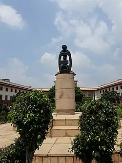 On 20 February 1978, a 210 cm (83 in) high bronze sculpture of "Mother and Child" was installed in the lawn of the court building. It was designed by Chintamoni Kar, who described the statue as "Mother India sheltering young republic represented by the symbol of a child upholding the law of the country shown in the form of an open book, with the symbol of the balance representing law and justice". The official court account states that it represents a "dispensation of equal justice to all".[15] The sculpture is located at the center of the park on the lawn of the court besides the statue of Mahatma Gandhi, which is in front of the staircase of the central wing in the front lawn.[15]