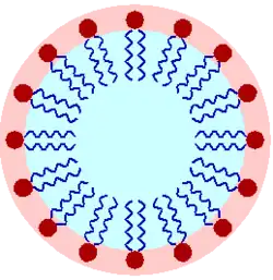 Surfactant-oil droplets in water. The oil is dispersed in water and the surfactant is at the oil-water interface. -