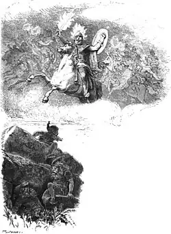In Norse mythology, Surtr (Old Norse "black"[1] or more narrowly "swart",[2] Surtur in modern Icelandic), also sometimes written Surt in English,[3] is a jötunn; he is the greatest of the fire giants and further serves as the guardian of Muspelheim, which is one of the only two realms to exist before the beginning of time, alongside Niflheim.[4] Surtr is attested in the Poetic Edda, compiled in the 13th century from earlier traditional sources, and the Prose Edda, written in the 13th century by Snorri Sturluson. In both sources, Surtr is foretold as being a major figure during the events of Ragnarök; carrying his bright sword, he will go to battle against the Æsir, he will battle the major god Freyr, and afterward the flames that he brings forth will engulf the Earth.