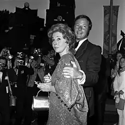 During World War II, Hayward supported the war effort by volunteering at the Hollywood Canteen, where she met her first husband, actor Jess Barker. They married on July 23, 1944, and in early 1945 fraternal twin sons were born.[43] The marriage was turbulent, with a judge granting an interlocutory divorce decree on August 17, 1954.[44] During the contentious divorce proceedings, Hayward stayed in the United States rather than join the Hong Kong location shoot for the film Soldier of Fortune. She shot her scenes on a sound stage with co-star Clark Gable in Hollywood. A few brief, distant scenes of Gable and a Hayward double walking near landmarks in Hong Kong were combined with the indoor shots. By April 1955, the stress of divorce proceedings and overwork prompted Hayward to attempt suicide by overdosing on sleeping pills.[44] After taking the pills, she quickly regretted her decision and, in a panic, called her mother, who sent for the police; they had to break down the back door to reach her.[45][46] Several months later, Hayward got into a violent fight with actress Jil Jarmyn after the latter found Hayward with her boyfriend, Donald Barry in his bedroom. When confronted about the fight, Hayward replied, "I'm red-haired and Irish, you know, and I don't let anybody call me names."[46][47]