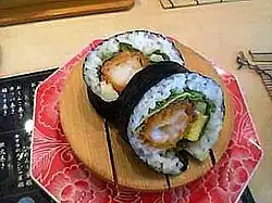 - Futomaki (太巻, "thick, large, or fat rolls") is a large, cylindrical style of sushi, usually with nori on the outside.[38] A typical futomaki is five to six centimeters (2 to 2+1⁄2 in) in diameter.[39] They are often made with two, three, or more fillings that are chosen for their complementary tastes and colors. Futomaki are often vegetarian, and may use strips of cucumber, kampyō gourd, takenoko (bamboo shoots), or lotus root. Strips of tamagoyaki omelette, tiny fish roe, chopped tuna, and oboro whitefish flakes are typical non-vegetarian fillings.[38] Traditionally, the vinegared rice is lightly seasoned with salt and sugar. Popular proteins are fish cakes, imitation crab meat, egg, tuna, or shrimp. Vegetables usually include cucumber, lettuce, and takuan (沢庵, pickled radish).