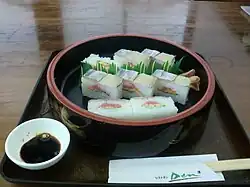 Oshizushi wrapped in persimmon leaves, a specialty of Nara, is known as kakinohazushi (柿の葉寿司).