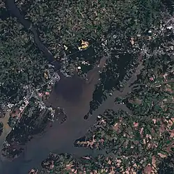 Satellite photo of the river (upper left) where it empties into the Chesapeake Bay (center)