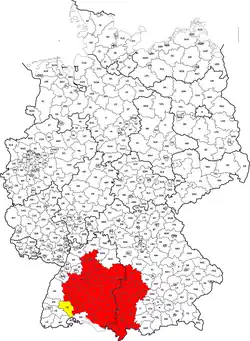 Today's Swabia within Germany. The Schwarzwald-Baar-Kreis (yellow) is at the transitional area of the Swabian, Upper Rhenish and Lake Constance dialects of Alemannic. The western Bodenseekreis district is not considered a part of modern Swabia. The dividing line is between Baden-Württemberg (west) and Bavaria (east).
