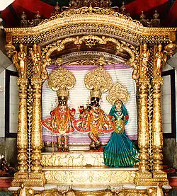Madan Mohan and Radha (centre and right) with Swaminarayan in the form of Hari Krishna (left), installed by Swaminarayan on the central altar in Dholera (1826)