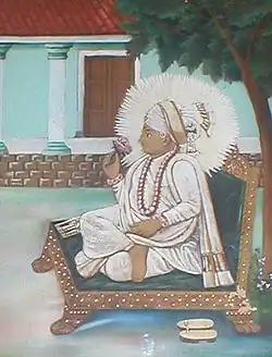 At the age of 21, Sahajanand Swami was appointed successor to Ramanand Swami as the leader of the Uddhava Sampradaya[32] by Ramanand Swami, prior to his death. His sucessessional was initially opposed by some members of the group who split off, but was soon accepted as the leader of the satsang and as a manifestation of god.[33] The Uddhava Sampradaya henceforth came to be known as the Swaminarayan Sampradaya.[34] According to sources he proclaimed the worship of one sole deity, Krishna or Narayana.[35] Krishna was considered by him his own ishtadevata. In contrast with the Vaishnava sect known as the Radha-vallabha Sampradaya,[36] he had a more puritanical approach, rather than the theological views of Krishna that are strongly capricious in character and imagery. While being a worshipper of Krishna, Swaminarayan rejected licentious elements in Krishnology in favor of worship in the mood of majesty, alike to earlier Vaishnava teachers, Ramanuja and Yamunacharya.[37]