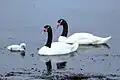 A familiar behaviour of swans is that they mate for life and typically bond even before they reach sexual maturity. Trumpeter swans, for example, can live as long as 24 years and only start breeding at the age of 4–7, forming monogamous pair bonds as early as 20 months.[23] "Divorce", though rare, does occur; one study of mute swans shows a 3% rate for pairs that breed successfully and 9% for pairs that do not.[24] The pair bonds are maintained year-round, even in gregarious and migratory species like the tundra swan, which congregate in large flocks in the wintering grounds.[25]