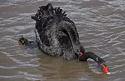 Swans feed in water and on land. They are almost entirely herbivorous, although they may eat small amounts of aquatic animals. In the water, food is obtained by up-ending or dabbling, and their diet is composed of the roots, tubers, stems, and leaves of aquatic and submerged plants.[16]