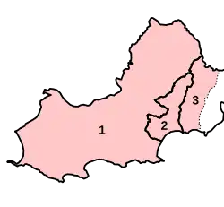 In 1887, Swansea was a township at the mouth of the river Tawe, covering 4,562 acres (1,846 hectares) in the county of Glamorgan.[43] There were three major extensions to the boundaries of the borough: the first in 1835, when Morriston, St Thomas, Landore, St John-juxta-Swansea and part of Llansamlet parish were added; again in 1889, when areas around Cwmbwrla and Trewyddfa were included; and when the borough was enlarged in 1918 to include the whole of the ancient parish of Swansea, the southern part of Llangyfelach parish, all of Llansamlet parish, Oystermouth Urban District and Brynau parish.[44][45]