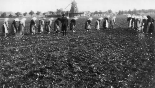 Female laborers at a late-19th-century Swedish sugar beet plantation. Sugar production remained non-mechanized and labor-intensive with low wages throughout the 19th century, fuelling the workers' dream of American opportunity and modern agricultural machinery.