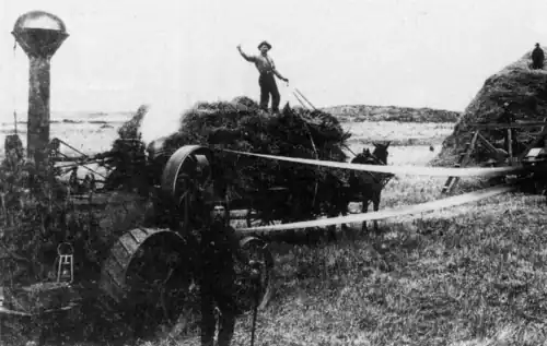 Steam-driven threshing machine near Hallock, Minnesota, 1882