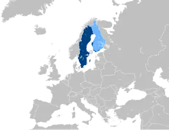 ![]() Regions where Swedish is an official language spoken by the majority of the population (Sweden, Åland, Western Finland) Regions where Swedish is an official language spoken by a minority of the population (Finland) | |