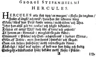 Renaissance literature is considered to have been written between 1658 and 1732. It was in 1658 that Georg Stiernhielm published his Herculus, the first hexametrical poem in the Swedish language.