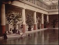 Ancient Greeks and Romans built artificial pools for athletic training in the palaestras, for nautical games and for military exercises. Roman emperors had private swimming pools in which fish were also kept, hence one of the Latin words for a pool was piscina. The first heated swimming pool was built by Gaius Maecenas in his gardens on the Esquiline Hill of Rome, likely sometime between 38 and 8 BC.[2] Gaius Maecenas was a wealthy imperial advisor to Augustus and considered one of the first patrons of arts.[3]