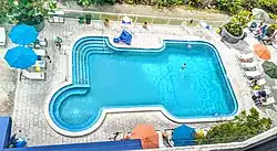 Many upscale hotels and holiday resorts have a swimming pool for use by their guests. If a pool is in a separate building, the building may be called a natatorium. The building may sometimes also have facilities for related activities, such as a diving tank. Larger pools sometimes have a diving board affixed at one edge above the water.