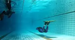 Diving in shallow areas of a pool may also lead to significant head and neck injuries; diving, especially head-first diving, should be done in the deepest point of the pool. Different organizations have different minimum requirements on safe pool depth for diving. The American Red Cross recommends a minimum depth of 9 feet, while the Department of Health of the New York state prohibits diving in less than 8 feet of water.[56] Olympic diving pools for diving from up to 10 meters (~32 feet) must comply with the World Aquatics' guidelines, which require the pool to be 5 meters (~16 feet) deep.[57]