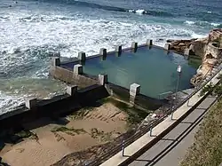 In the early 20th century, especially in Australia, ocean pools were built, typically on headlands by enclosing part of the rock shelf, with water circulated through the pools by flooding from tidal tanks or by regular flooding over the side of the pools at high tide. This continued a pre-European tradition of bathing in rockpools with many of the current sites being expanded from sites used by Aboriginal Australians or early European settlers. Bathing in these pools provided security against both rough surf and sea life. There were often separate pools for women and men, or the pool was open to the sexes at different times with a break for bathers to climb in without fear of observation by the other sex.[40] These were the forerunners of modern "Olympic" pools. A variation was the later development of sea- or harbour-side pools that circulated sea water using pumps. A pool of this type was the training ground for Australian Olympian Dawn Fraser.