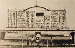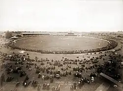 In 1896 the Ladies' Stand was opened, along with a concrete cycling track which circled the inside of the ground.[3] One of the carpenters who built the formwork for the track was George Bradman, father of Don Bradman. In 1898 floodlights were built over the cycling track so that night events could be held. In 1904 the scoreboard was rebuilt at the top of The Hill and in 1909 the Sheridan Stand, named after Phil Sheridan, was opened at the southern end, replacing the earlier Smokers' Stand.
