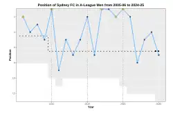 Overall, the 2018–19 season was largely a success for Steve Corica's first season in charge and the team's first season away from Allianz Stadium. They finished in the top two in all domestic competitions. However, their performance in the 2019 AFC Champions League was disappointing, as they failed to progress from the group stage. Finishing at the bottom of their group, with just three points from six matches.[100][101]
