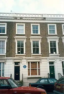 The couple moved back to England in December 1959 and lived in London at 3 Chalcot Square, near the Primrose Hill area of Regent's Park, where an English Heritage plaque records Plath's residence from 1960-1961.[31][32] Their daughter Frieda Rebecca was born on April 1, 1960, and in October, Plath published The Colossus, her first collection of poetry.[31]