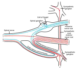 Sympathetic nerves arise from near the middle of the spinal cord in the intermediolateral nucleus of the lateral grey column, beginning at the first thoracic vertebra of the vertebral column and are thought to extend to the second or third lumbar vertebra. Because its cells begin in the thoracolumbar division – the thoracic and lumbar regions of the spinal cord – the sympathetic nervous system is said to have a thoracolumbar outflow. Axons of these nerves leave the spinal cord through the anterior root. They pass near the spinal (sensory) ganglion, where they enter the anterior rami of the spinal nerves. However, unlike somatic innervation, they quickly separate out through white rami connectors (so called from the shiny white sheaths of myelin around each axon) that connect to either the paravertebral (which lie near the vertebral column) or prevertebral (which lie near the aortic bifurcation) ganglia extending alongside the spinal column.