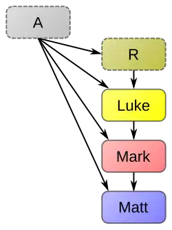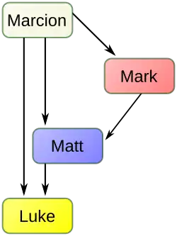- ^ Though eponymous and some haphazard structural names are prevalent in the literature, a systematic structural nomenclature is advocated by Carlson and Smith, and these names are also provided. The exception is the hypothesis of the priority of the Gospel of Marcion which is not part of their nomenclatures.
