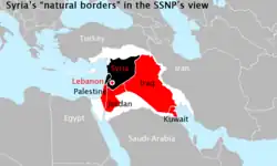 The Syrian Social Nationalist Party (SSNP; Arabic: الحزب السوري القومي الاجتماعي, romanized: al-Ḥizb al-Sūrī al-Qawmī al-ijtimāʻī) is a Syrian nationalist party operating in Syria, Lebanon, Jordan and Palestine. It advocates the establishment of a Greater Syrian nation state spanning the Fertile Crescent, including present-day Syria, Lebanon, Jordan, Iraq, Kuwait, Palestine region (includes Israel and its occupied territories), Cyprus, Sinai of Egypt, Hatay and Cilicia of Turkey, based on geographical boundaries and the common history people within the boundaries share.[22] It has also been active in the Syrian and Lebanese diaspora, for example in South America.[23] Until the fall of the Assad regime it was an ally of the ruling Arab Socialist Ba'ath Party, being the second-ranking party in the National Progressive Front.