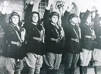 According to historian Stanley G. Payne, interwar Arab nationalism was influenced by European fascism, with the creation of at least seven Arab nationalist shirt movements similar to the brown shirt movement by 1939, with the most influenced ones being the SSNP, the Iraqi Futawa youth movement and the Young Egypt movement.[80] These three movements would share characteristics like being territorially expansionist, with the SSNP wanting the complete control of Syria, belief in the superiority of their own people (with Saadeh theorizing a "distinct and naturally superior" Syrian race), being "nonrationalist, anti-intellectual, and highly emotional" and "[emphasizing] military virtues and power [and stressing] self-sacrifice".[80] Also according to Payne, all these movements received strong influence from European fascism and praised the Italian and German fascism but "[they never became] fully developed fascist movements, and none reproduced the full characteristics of European fascism"; the influence in Arab nationalism remained long after 1945.[80] Also, Saadeh's superior race was not a pure one, but a fusion of all races in Syrian history.[80] The SSNP would be "[an] elite group, with little structure for mobilization".[80]