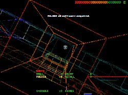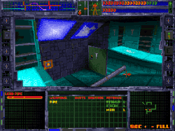 The player advances the plot by acquiring log discs and e-mails: the game contains no non-player characters with which to converse.[7][8][9] Throughout the game, an evil artificial intelligence called SHODAN hinders the player's progress with traps and blocked pathways.[10] Specific computer terminals allow the player to temporarily enter Cyberspace; inside, the player moves weightlessly through a wire-frame 3D environment, while collecting data and fighting SHODAN's security programs. Actions in Cyberspace sometimes cause events in the game's physical world; for example, certain locked doors may only be opened in Cyberspace.[7] Outside of Cyberspace, the player uses the game's sixteen weapons, of which a maximum of seven may be carried at one time, to combat robots, cyborgs and mutants controlled by SHODAN. Projectile weapons often have selectable ammunition types with varying effects; for example, the "dart pistol" may fire either explosive needles or tranquilizers.[7][8] Energy weapons and several types of explosives may also be found, with the latter ranging from concussion grenades to land mines.[7]