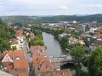 There were three bombing raids on the town during Second World War, but damage was comparatively slight: the Neckar Bridge and some 85 houses.[19] In April 1945, the town was surrendered to the French who were to remain as occupiers until the creation of the German Federal Republic in 1949, and as an allied garrison until the end of the Cold War in 1991.