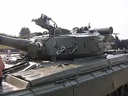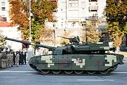 The T-84-120 Yatagan was developed in 2000 in Kharkiv to NATO standards for the Turkish tender for a new MBT.[8] The tank featured a 120mm smooth bore gun that was capable of firing AT-11 Sniper ATGMs, a reloading mechanism and blow-out panels.[8] The Yatagan was also equipped with communications equipment from the French Thomson company, an FN Herstal machine gun, automatic transmission, a 6TD-2 diesel engine with 1200hp and FCS taken from Oplot.[9] In total, three 120mm guns of different designs were tested on the tank.[10] The T-84-120 Yatagan also participated in the Kyiv parade.[11] The current condition of the tank is unknown.[9]