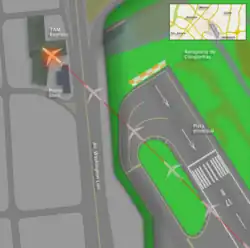 On both of Congonhas Airport's runways (35L/17R and 35R/17L), a slope prevented the drainage of accumulated water on the asphalt. The surface was already smooth due to excess rubber from the increased braking required on landing.[10] There were no runway end safety areas, as Avenida Washington Luís (a busy avenue), as well as several buildings and houses, were located at the end of runways 35L and 35R. On 24 July 2006, less than a year before the accident, a Boeing 737 of BRA Transportes Aéreos had difficulty stopping on runway 35L, but the pilots were able to bring the aircraft to a stop safely by performing a ground loop.[11] Due to delays and flight cancellations caused by rains in early 2007, Infraero (the company that manages Congonhas Airport) decided to resurface the airport's main runway. The installation of channeling grooves was planned to reduce the risk of hydroplaning.[12][11] The resurfacing work was completed on June 29, but the grooves were not added. Infraero stated that adding the grooves would require an additional 30 days. Despite the incomplete refit, the Congonhas runway remained open for use during the 2006–07 Brazilian aviation crisis.[11]