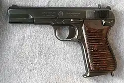 - Type 68: Also known as the Type 66/68 and M68,[17][6] it was produced at the Chongyul Arms Plant and can be distinguished from the TT-33 by the shorter barrel,[d] and the serrations on the rear of the slide, intended to give the shooter a grip while the gun is being cocked.[29] Other differences include a magazine catch on the base of the grip,[6] a tilting-barrel system similar to the Browning Hi-Power, a modified firing pin and reinforced slide stop. TT-33 magazines can be used on the Type 68, but not vice versa.[29] During the 1980s the Type 68 was gradually replaced by the Baek Du San pistol, a North Korean copy of the Czechoslovak CZ 75 pistol.[30]