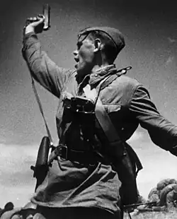The TT-33 was primarily issued to officers,[16] though some enlisted non-commissioned officers and specialists (such as snipers) were also issued with handguns as well.[37] Cavalry units carried the Nagant 1895 revolver instead, since the lack of an external safety on the TT pistol presented a risk to both horse and rider.[38]
