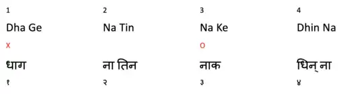 - ^ Courtney, Todd A. Dombrowski, David. "Basic Technique of Tabla bols: Dhaa, Dhin, Ga, Ka, Naa, Na, Taa, Tak, TiRaKiTa, Tin, Tu, etc". chandrakantha.com. Archived from the original on 26 April 2017. Retrieved 3 September 2016.