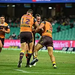 - grapple tackle – a controversial rugby league tackling technique similar to a chokehold.[22]