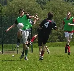 The most spectacular form of tackle in association football is the slide tackle, wherein a tackler slides, leg extended, along the ground, aiming to hit the ball away.[1] This form of tackle carries a high risk of committing a foul.